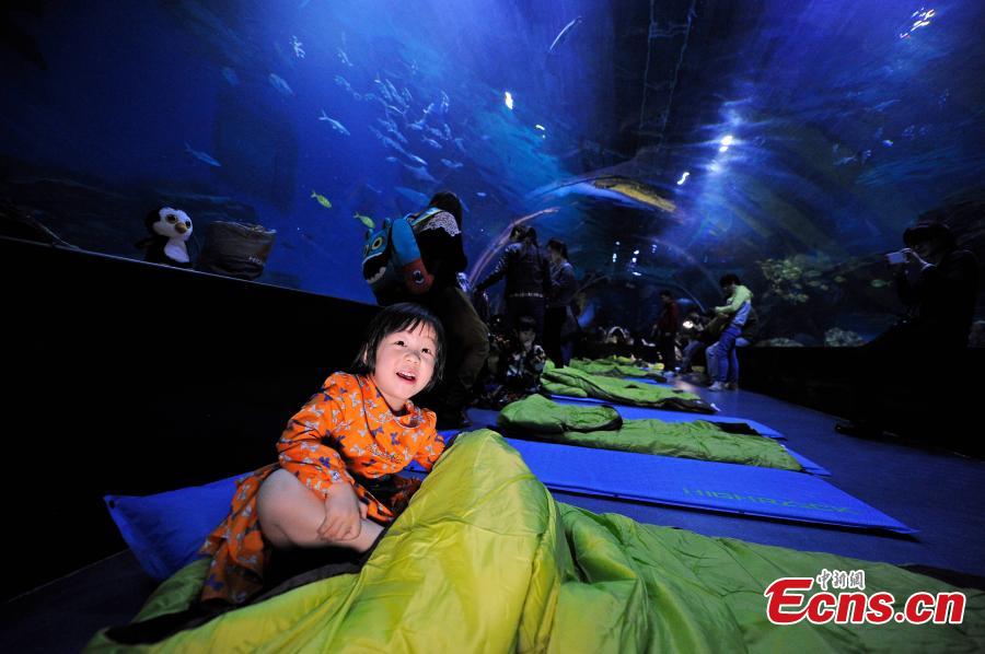 Visitors look at fish swimming in tank during a sleepover event at an aquarium in Tianjin municipality on March 28, 2015. The aquarium invited visitors to spend a fun-filled night exploring the mysterious creatures of the sea. (Photo/ Tong Yu)