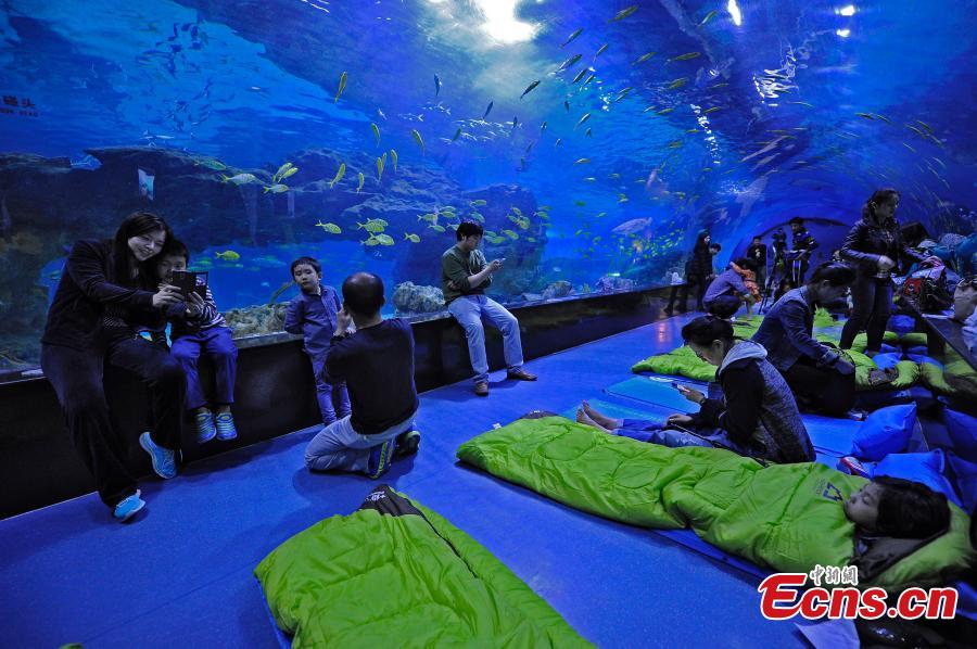 Visitors look at fish swimming in tank during a sleepover event at an aquarium in Tianjin municipality on March 28, 2015. The aquarium invited visitors to spend a fun-filled night exploring the mysterious creatures of the sea. (Photo/ Tong Yu) |