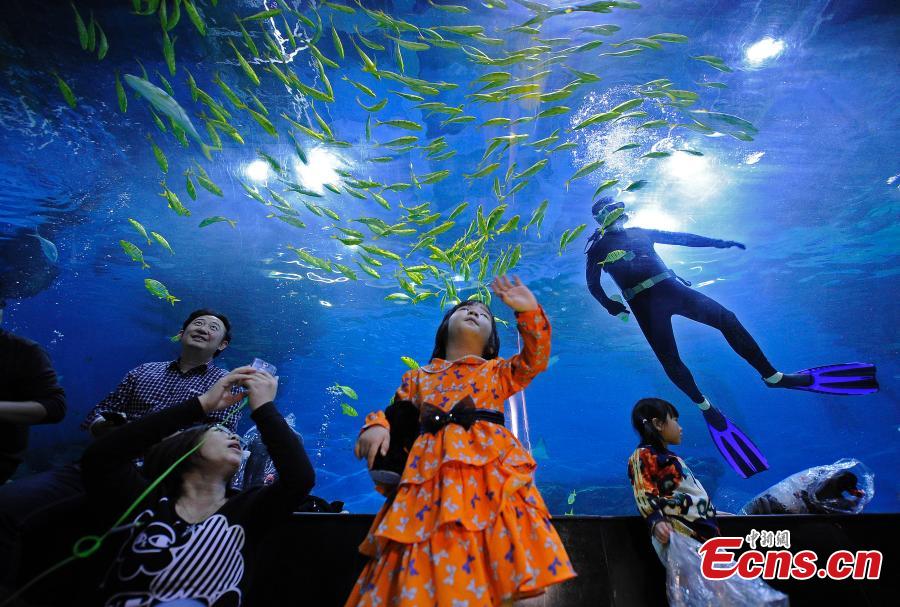Visitors look at fish swimming in tank during a sleepover event at an aquarium in Tianjin municipality on March 28, 2015. The aquarium invited visitors to spend a fun-filled night exploring the mysterious creatures of the sea. (Photo/ Tong Yu)