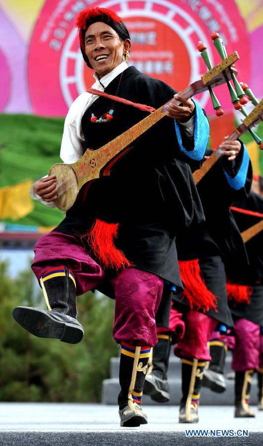 An actor performs Duixie, a traditional local dance prevailed in Tibet, in Gala Village of Nyingchi Prefecture, southwest China's Tibet Autonomous Region, March 30, 2015. The 13th Nyingchi Peach Blossom Cultural Tourism Festival kicked off here on Monday, where a series of activities are held for visitors to enjoy the spring view and local culture. (Xinhua/Liu Dongjun) |