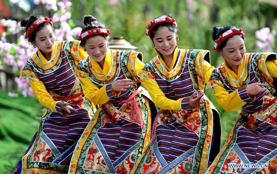 Folk performers dance during the 13th Nyingchi Peach Blossom Cultural Tourism Festival, in Gala Village of Nyingchi Prefecture, southwest China's Tibet Autonomous Region, March 30, 2015. The 13th Nyingchi Peach Blossom Cultural Tourism Festival kicked off here on Monday, where a series of activities are held for visitors to enjoy the spring view and local culture. (Xinhua/Liu Dongjun) |