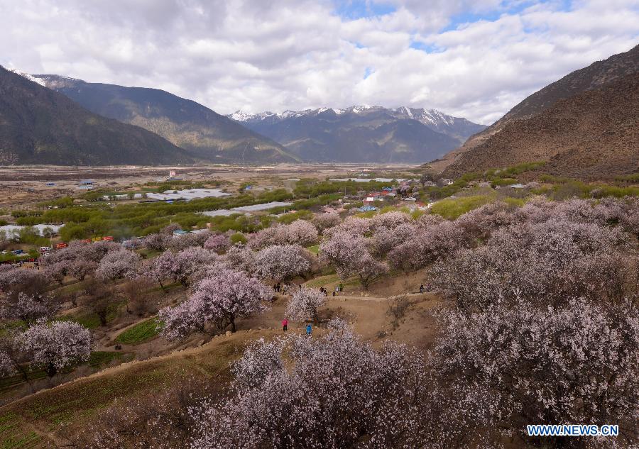 Photo taken on March 30, 2015 shows the scenery of peach grove in Gala Village of Nyingchi Prefecture, southwest China's Tibet Autonomous Region. The 13th Nyingchi Peach Blossom Cultural Tourism Festival kicked off here on Monday, where a series of activities are held for visitors to enjoy the spring view and local culture. (Xinhua/Liu Dongjun) |