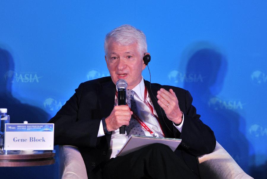 Gene Block, Chancellor of UCLA, speaks at a sub-forum with the theme of "University Presidents' Dialogue: The Future of Education" during the 2015 Boao Forum for Asia (BFA) in Boao, south China's Hainan Province, March 29, 2015. (Xinhua/Yang Guanyu) |