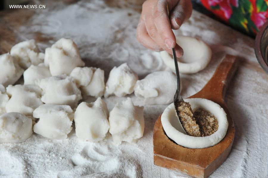 A worker make Qingtuan, or green rice balls, at a pastry shop in Lin'an City, east China's Zhejiang Province, March 29, 2015. Qingtuan, made from glutinous rice mixed with wormwood juice, is a traditional snack popular among people living in the south of Yangtze River during the Qingming Festival (Tomb Sweeping Day). (Xinhua/Hu Jianhuan) |
