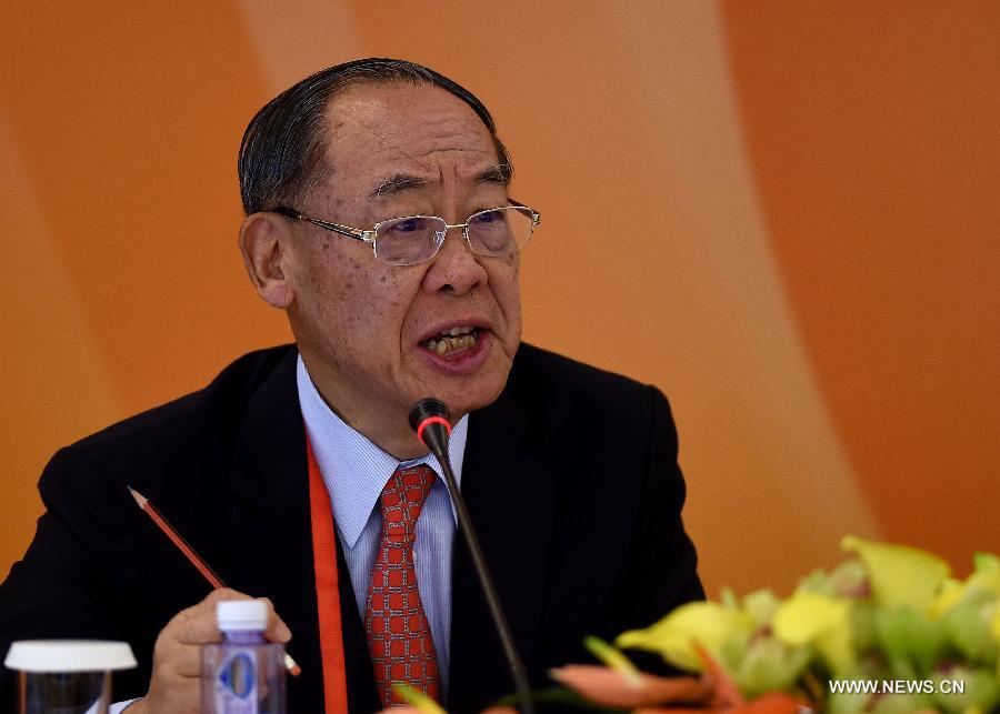Fredrick F. Chien, Senior Advisor of Cross-Straits Common Market Foundation, speaks at a Boao Forum for Asia (BFA) Cross-Straits Business Roundtable with the theme of "Innovate and Benefit All: A New Future of Cross-Straits Economic Cooperation" during the 2015 BFA in Boao, south China's Hainan Province, March 29, 2015. (Xinhua/Guo Cheng) |