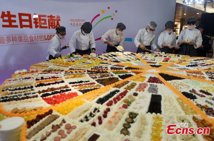 People gather around a giant fruitcake of 3.29 meters in diameter in Nanjing, capital of East China's Jiangsu province, March 28, 2015. The cake was made with 329 ingredients, including strawberry, mango, grape and ginseng fruit. Hundreds of citizens lined up to taste a slice of this giant cake. (Photo: China News Service/Yang Bo)