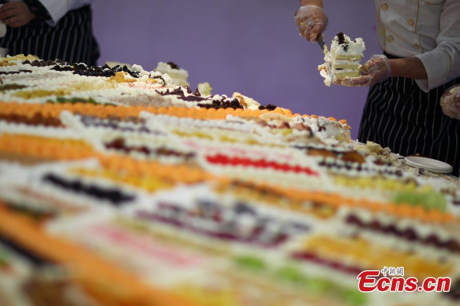 People gather around a giant fruitcake of 3.29 meters in diameter in Nanjing, capital of East China's Jiangsu province, March 28, 2015. The cake was made with 329 ingredients, including strawberry, mango, grape and ginseng fruit. Hundreds of citizens lined up to taste a slice of this giant cake. (Photo: China News Service/Yang Bo) |