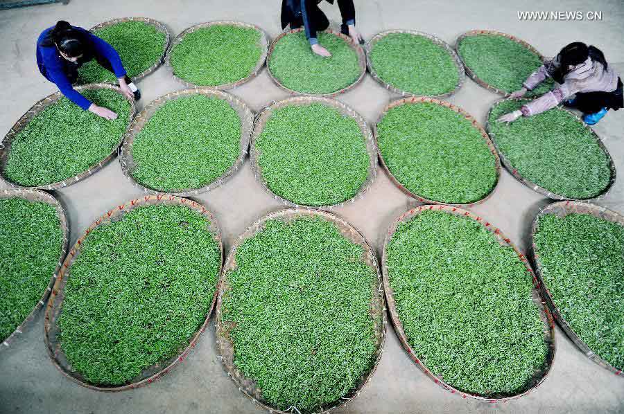 Tea farmers air fresh tea leaves in Zhongxi Village of Rao'er Township of Dexing City, east China's Jiangxi Province, March 29, 2015. Tea makers are making tea with newly-picked tea leaves before the Qingming Festival, which falls on April 5 this year, as tea of this period of time is regarded to have a better taste. (Xinhua/Zhuo Zhongwei) |
