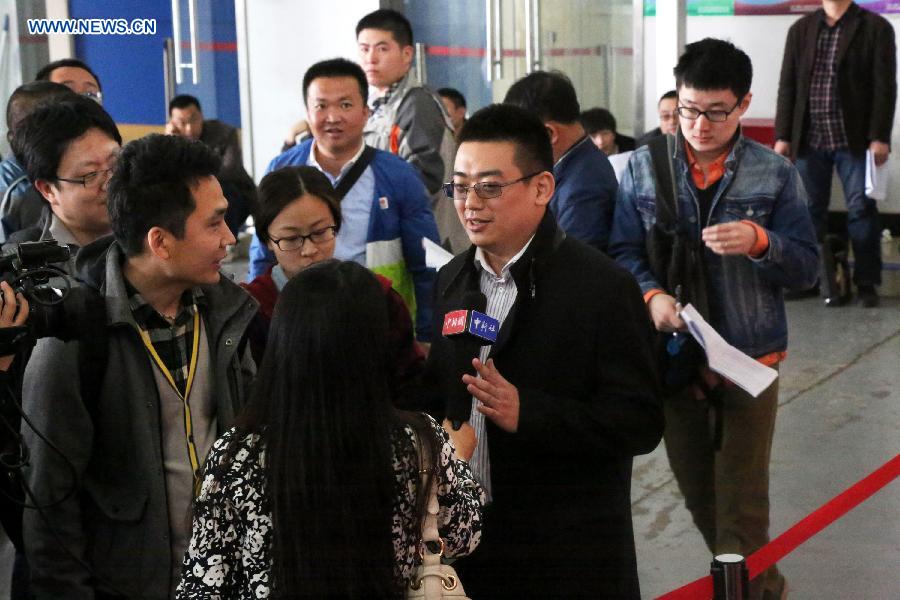 A bidder (R, front) receives interview during an auction of the second batch of official vehicles in Beijing, capital of China, March 30, 2015. A total of 103 official vehicles were under the gavel at an auction house in Beijing on March 30. The official cars are among more than 3,000 taken out of service as part of reform measures that began last July to slash spending in this area. (Xinhua/Liu Xianguo) |