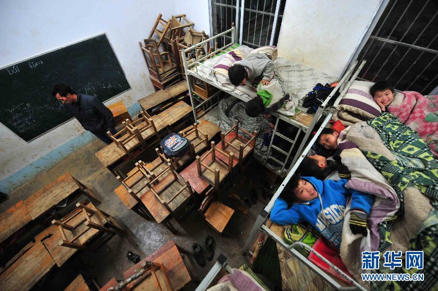 Students sleep in the beds near the desks in the classroom on Dec. 18, 2014. The new dormitory was under construction at the moment. (Xinhua/Huang Xiaobang)