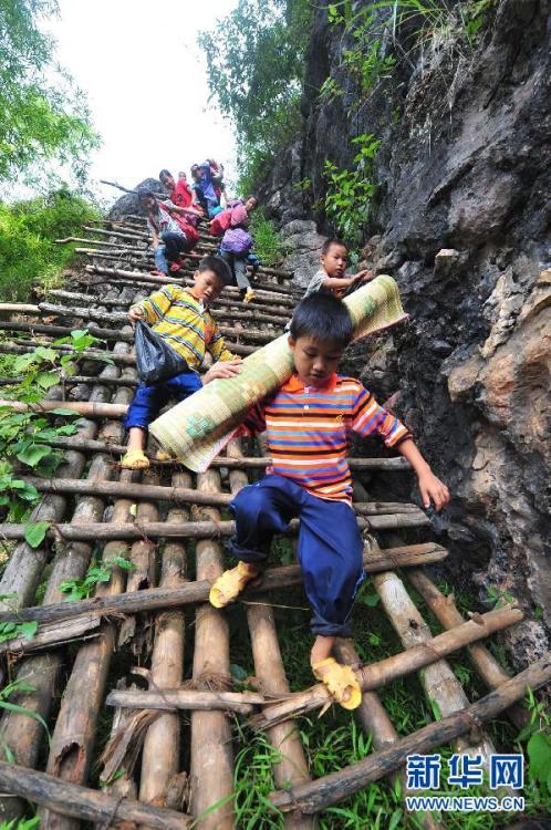 Carrying all the supplies, the children climb the mountain to go to school on Sept. 3, 2012. (Xinhua/Huang Xiaobang)