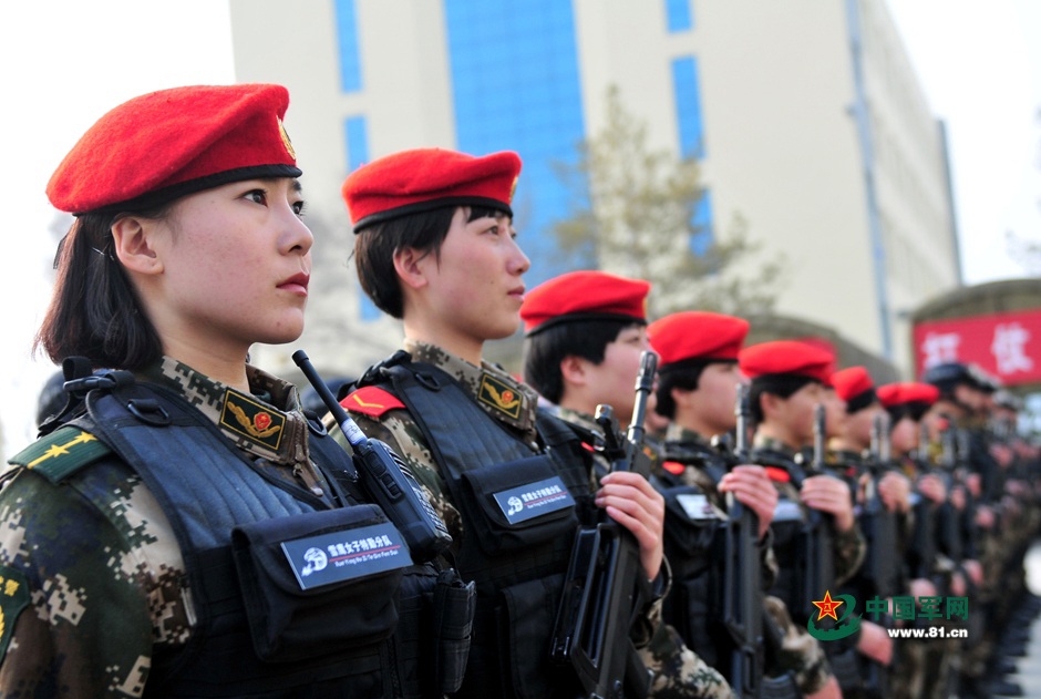 Team members of "Snow Eagle", a female detachment of Xinjiang Border Guard Corps, participate in the establishment ceremony on March 11, 2015. (Chinamil.com.cn/Fan Xinyu)