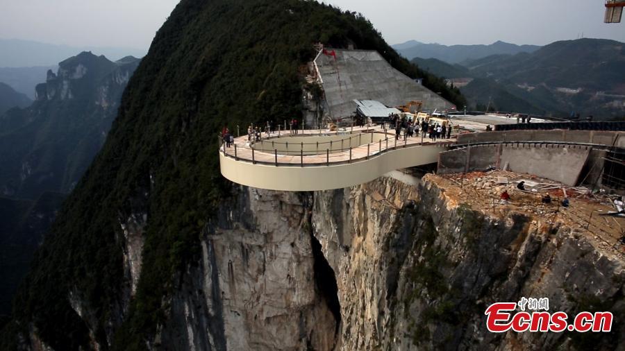 Workers are finishing the construction of a glass cantilever bridge in Longgang scenic area in Yunyang, Southwest China's Chongqing municipality. The transparent structure, 718 meters above the ground, has a cantilever extending 26.64 meters from the edge, five meters longer than the Grand Canyon Skywalk. The project, with a total investment of 35 million yuan($5.6 million), started in March 2014. The bridge has a carrying capacity of 1000 tons.(Photo: China News Service/Zhong Xin)