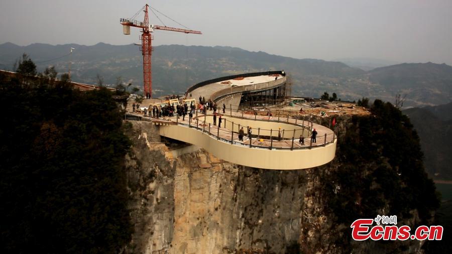 Workers are finishing the construction of a glass cantilever bridge in Longgang scenic area in Yunyang, Southwest China's Chongqing municipality. The transparent structure, 718 meters above the ground, has a cantilever extending 26.64 meters from the edge, five meters longer than the Grand Canyon Skywalk. The project, with a total investment of 35 million yuan($5.6 million), started in March 2014. The bridge has a carrying capacity of 1000 tons.(Photo: China News Service/Zhong Xin) |