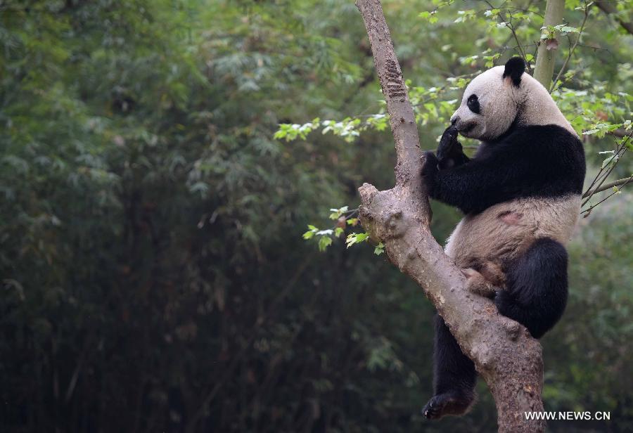Photo taken on March 31, 2015 shows giant panda Yalin at the Chengdu Research Base of Giant Panda Breeding in southwest China's Sichuan Province. A pair of giant pandas, the female one Shurong and the male one Yalin, were selected from 55 candidates who met the age requirement on Tuesday as gifts from the central government to Macao after three months of deliberation. The pandas, both 110 kilograms in weight, will be flown to Macao at the beginning of May, taking the place of two pandas previously sent as gifts. (Xinhua/Xue Yubin) |