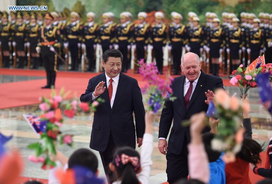 Chinese President Xi Jinping (L) holds a welcoming ceremony for Australian Governor-General Peter Cosgrove at the Great Hall of the People in Beijing, March 30, 2015. (Xinhua/Zhang Duo)