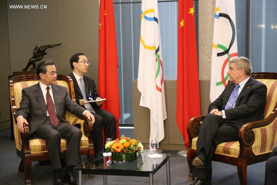 Chinese Foreign Minster Wang Yi (L) meets with International Olympic Committee (IOC) President Thomas Bach in the Olympic Museum in Lausanne, Switzerland, March 30, 2015. (Xinhua/Ling Xin)