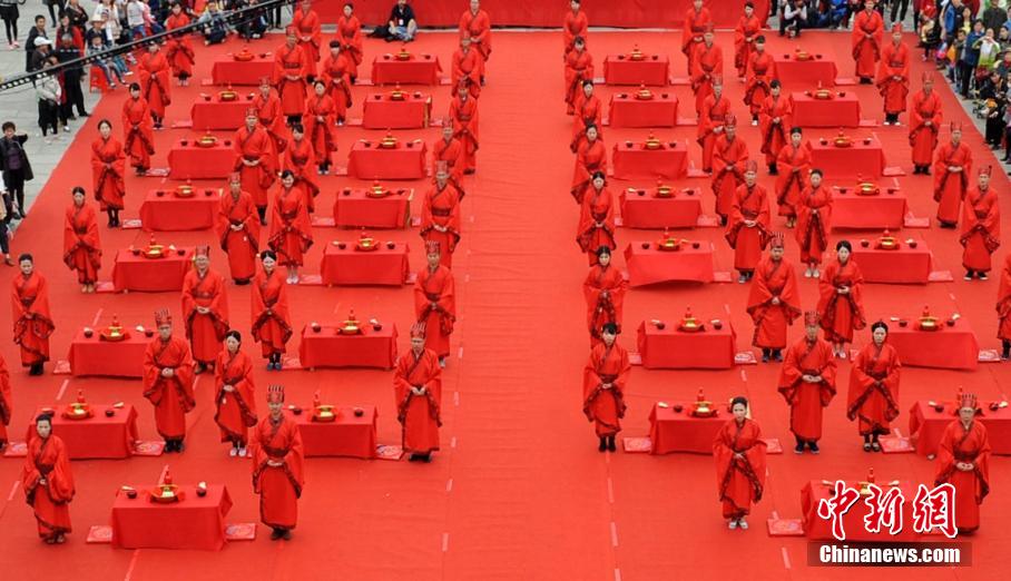 A group wedding ceremony is held in Hefei, Anhui province on March 29, 2015. 30 new couples in Han Chinese costumes perform a series of Han traditional wedding rituals. (CNS/Zhang Yayu)