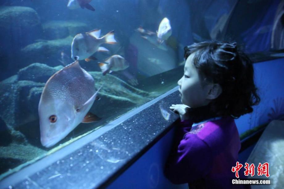 Guided by the staff, visitors spend a whole night in an aquarium to explore the night world of fishes which has never been revealed before in Tianjin on March 28, 2015. (CNS/Tong Yu)
