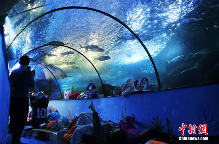 Guided by the staff, visitors spend a whole night in an aquarium to explore the night world of fishes which has never been revealed before in Tianjin on March 28, 2015. (CNS/Tong Yu)