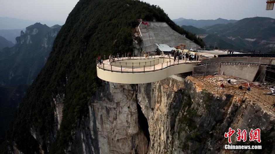 The world's longest glass cantilever bridge in Yunyang county, Chongqing, will be opened to tourists on May 1. The "Cloud bridge" is built on top of the cliffs 1,123 meters above sea level. The bridge is about 3.4 meters wide and 50 meters long, with a shape of flower. When one stands on it, he will feel totally "suspended" in the air without any line in sight. (Photo/CNS)