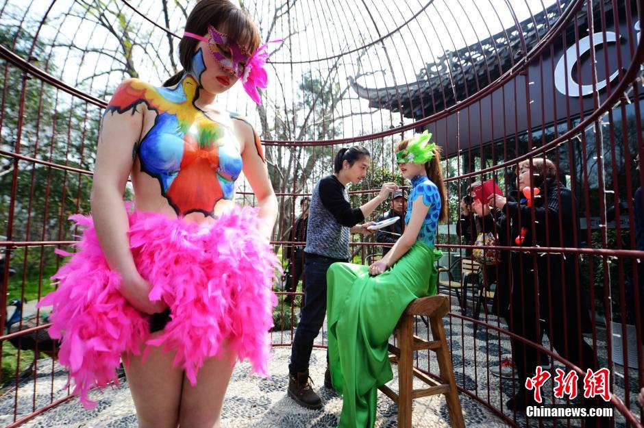 Lately a peacock themed body painting show was held in a giant birdcage in Yangzhou. Many citizens were attracted to the scene when artists painted on the bodies of the models. (Chinanews/Meng Delong)