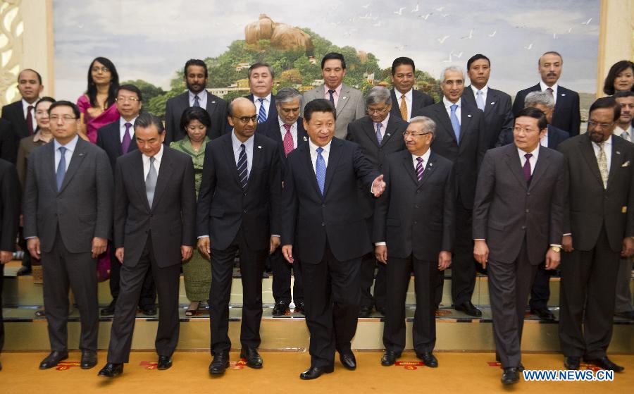 Chinese President Xi Jinping (C, front) meets with representatives of 21 Asian countries who signed the Memorandum of Understanding on Establishing Asian Infrastructure Investment Bank (AIIB) in Beijing, capital of China, Oct. 24, 2014. (Xinhua/Huang Jingwen) |
