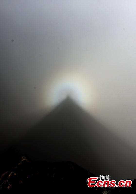 'Buddha's light,'a unique light phenomenon is seen on a peak of Mount Huangshan scenic spot in Huangshan city, East China's Anhui province on March 31, 2015. The special light effect only appears a couple of times per month on the mountain. (Photo:China News Service/ Shi Guangde) |