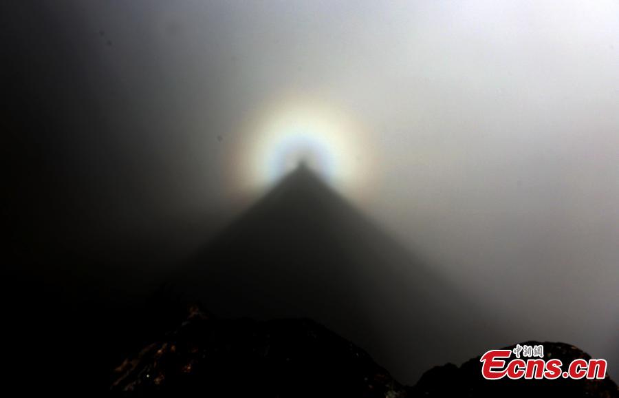 'Buddha's light,'a unique light phenomenon is seen on a peak of Mount Huangshan scenic spot in Huangshan city, East China's Anhui province on March 31, 2015. The special light effect only appears a couple of times per month on the mountain. (Photo:China News Service/ Shi Guangde) |