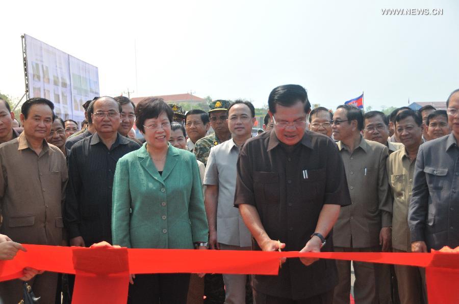 Cambodian Prime Minister Hun Sen (Front) cuts the ribbon to inaugurate a bridge and a road in Stung Treng province, Cambodia, April 1, 2015. Cambodia inaugurated a 1.73km Mekong River bridge, along with a 143km road, here on Wednesday in a bid to boost economic development and reduce poverty in this far northeastern region. (Xinhua/Li Hong) |