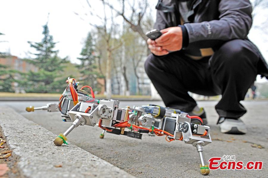 A student operates a robot with his cell phone to cross a barrier at the Tianjin University in North China’s Tianjin municipality, April 1, 2015. The multi-foot robot, the third generation developed by students of the university, can fold itself up and crawl away like a crab in different ground conditions, allowing a wider range of applications in aerospace, geological survey, and relief work. (Photo: China News Service/Tong Yu) |