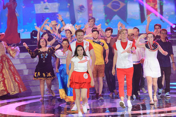 Monica Cunha da Silva from Brazil, the winner of the 13th Chinese Bridge -- Chinese Proficiency Competition for Foreign College Students, performs on stage along with her fellow competitors. [Photo provided to China.org.cn] |