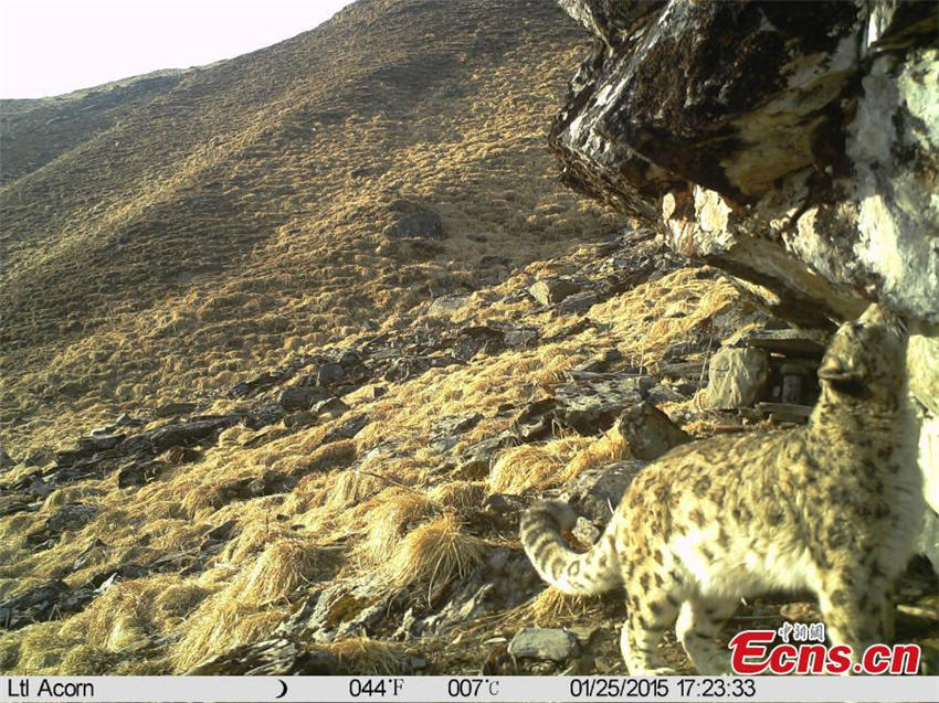 Picture of a snow leopard was captured by an infrared camera, set up at an altitude of 4,102 meters, at the Wolong National Nature Reserve in Southwest China’s Sichuan province, Jan. 1, 2015. In a short video clip, the snow leopard was also found roaming with its cub, about one year old, on the mountain. Snow leopards, one of China's Class A protected animals, are usually found in the Himalayan ranges of central and south Asia at altitudes between 3,000 and 5,500 meters. (Photo provided to China News Service) |