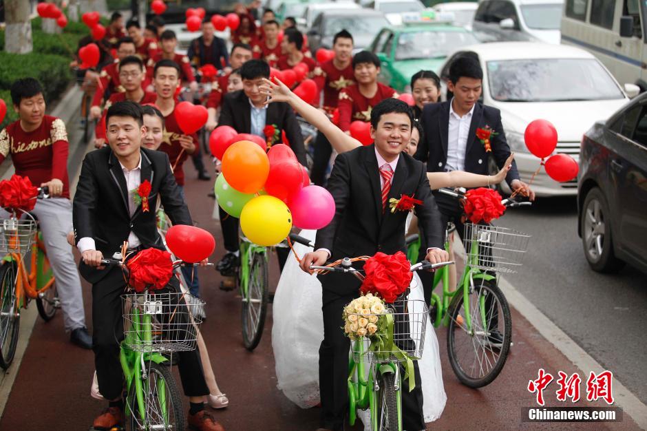 Zhang Yalong, a post-90s man, fetches his bride by public bicycles in Xi'an, capital of northwest China's Shaanxi Province, March 31, 2015. This romantic, chic and green way won high praise from the public. (CNS/Liang Meng)