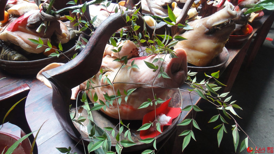 On March 30, 2015, tables in the ancestral temple are filled with well-decorated pig heads. (Photo source: people.cn)