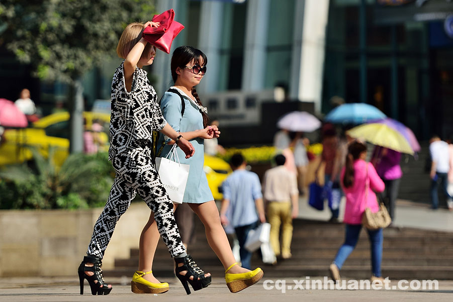A great number of women wore summer clothes on Wednesday in Chongqing, southwest China  as the maximum temperature went up to 35 degrees Celsius.