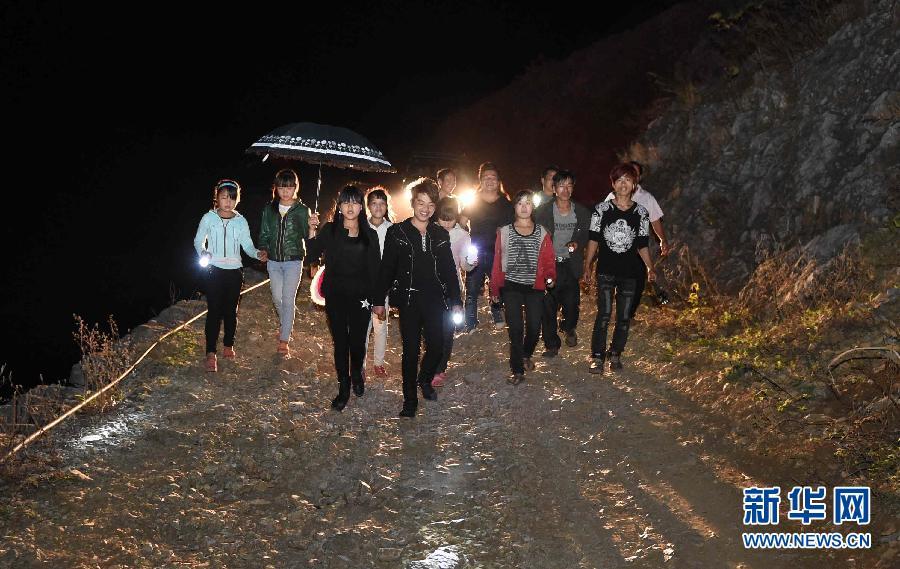 Meng Guide, welcomes and brings his fiancée with other villagers. (Xinhua/Huang Xiaobang)