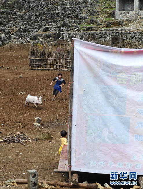 Lan Xin, 23, chases a pig in the field. (Xinhua/Huang Xiaobang)