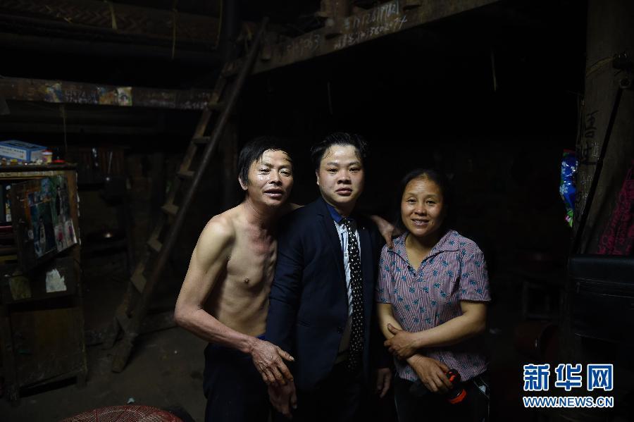 Lan Youping (middle), 23, takes photos with his parents before he leaves home. (Xinhua/Huang Xiaobang)