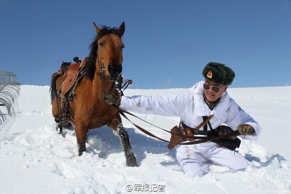 Soldiers patrol the China-Kazakhstan border line below the Tarbagatai Mountains, northwest China’s Xinjiang Uyghur Autonomous Region, April 1, 2015. Heavy snow hit northern part of Xinjiang recently; soldiers braved the cold of minus 10 degrees Celsius in guarding the security of the border line. (Photo/JZ.81.CN)