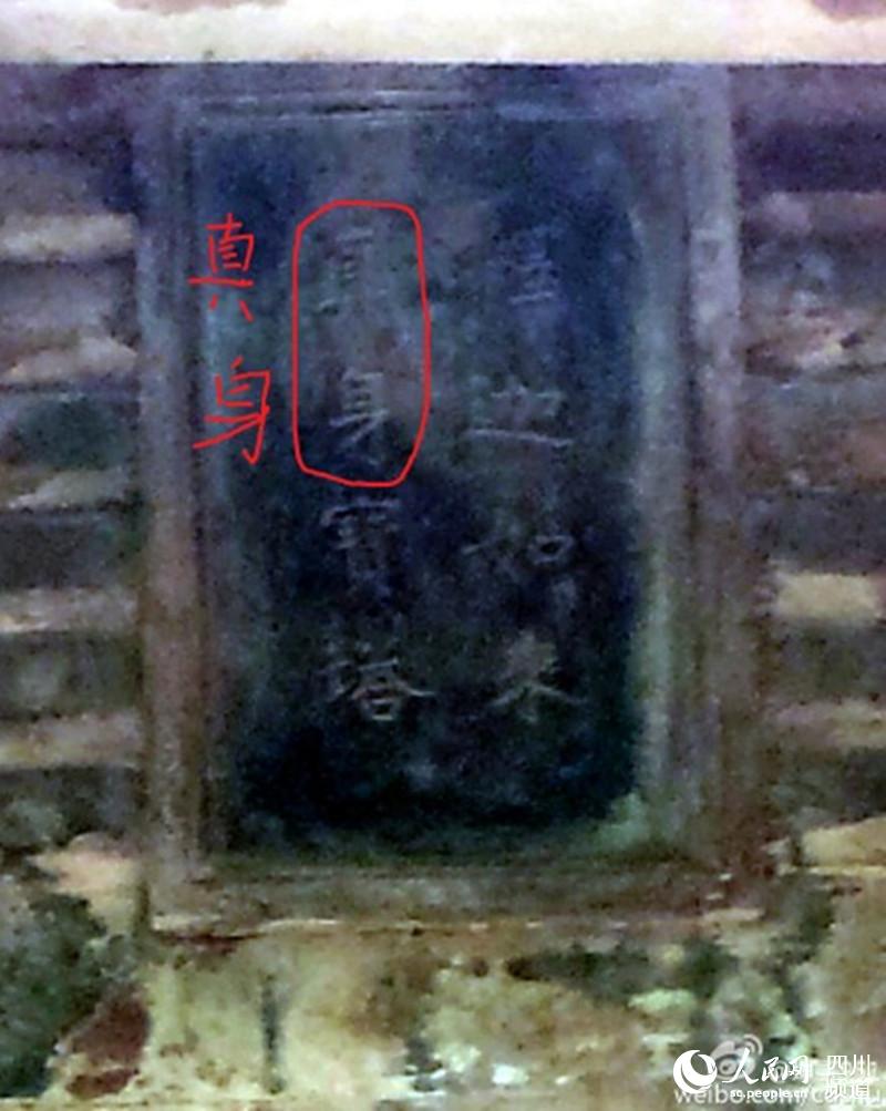The stone tablet. The red characters mean "relics of the Buddha". (Provided by the cultural relics bureau of Qionglai City)