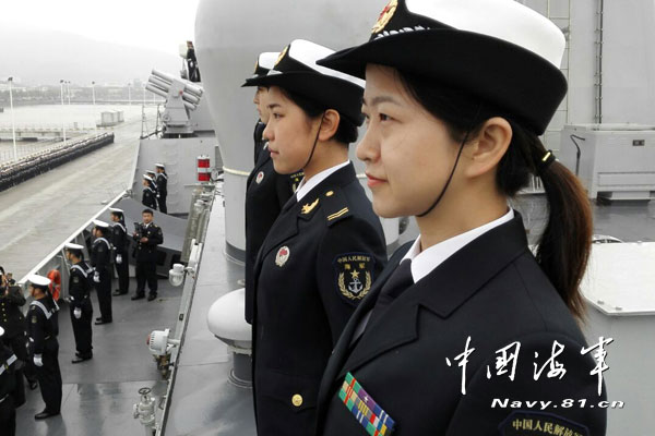 Female soldiers stand on the Chinese naval supply ship Qiandaohu on April 3, 2015.The 20th Chinese naval escort taskforce departs from a military port in Zhoushan, east China's Zhejiang province, and head for the Gulf of Aden and waters off Somali coast on the morning of April 3, 2015, to take over the escort mission from the 19th escort taskforce.(Photo: Chinamil.com.cn/Dai Zongfeng)
