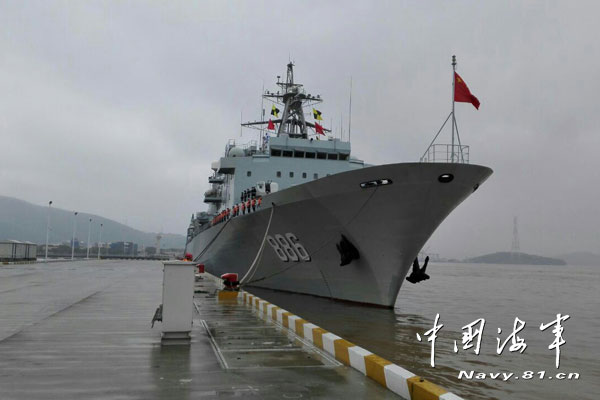 | The Chinese naval supply ship Qiandaohu berths at a military port in Zhoushan, east China's Zhejiang province on April 3, 2015. The 20th Chinese naval escort taskforce departs from a military port in Zhoushan, east China's Zhejiang province, and head for the Gulf of Aden and waters off Somali coast on the morning of April 3, 2015, to take over the escort mission from the 19th escort taskforce.(Photo: Chinamil.com.cn/Dai Zongfeng) |