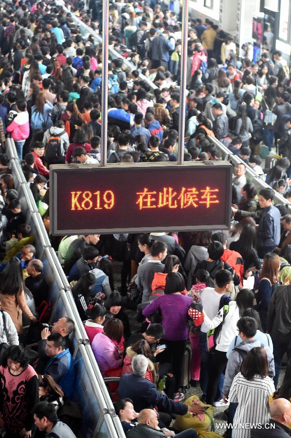 Passengers queue to take trains at Zhengzhou Railway Station in Zhengzhou, capital city of central China's Henan Province, April 3, 2015. Zhengzhou received a travel rush during China's traditional Qingming Festival, or Tomb-sweeping Day, which falls on April 5 this year. (Xinhua/Li Bo) |