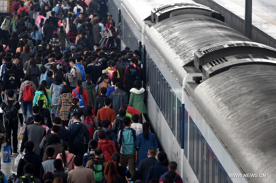 Passengers queue to get on trains at Zhengzhou Railway Station in Zhengzhou, capital city of central China's Henan Province, April 3, 2015. Zhengzhou received a travel rush during China's traditional Qingming Festival, or Tomb-sweeping Day, which falls on April 5 this year. (Xinhua/Li Bo) |