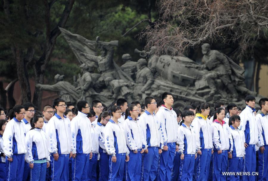 Students mourn for revolutionary martyrs in Shenyang, capital of northeast China's Liaoning Province, April 3, 2015. People started mourning for departed relatives and martyrs as the Qingming Festival is coming. (Xinhua/Zhang Wenkui)