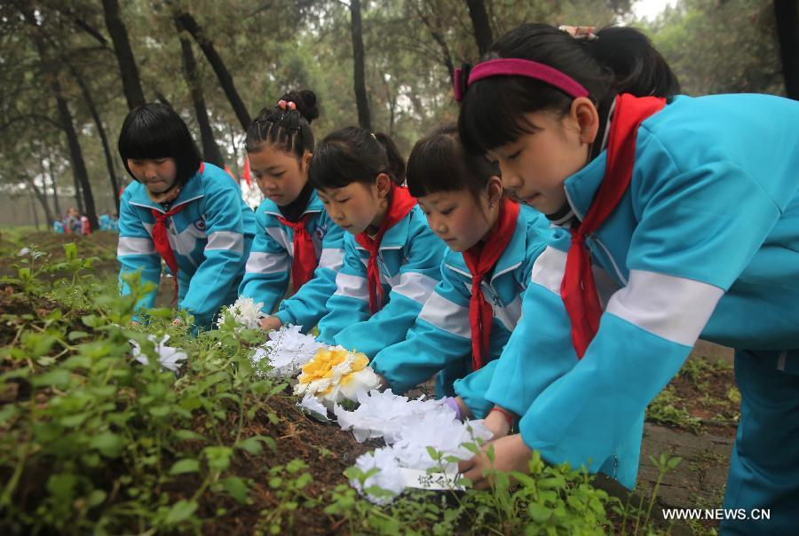 Pupils lay paper flowers to a tomb at a Martyrs' Park in Pingdingshan, central China's Henan Province, April 3, 2015. People started mourning for departed relatives and martyrs as the Qingming Festival is coming. (Xinhua/He Wuchang)