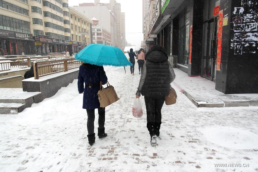 People walk on a snowy road in Bei'an of Heihe City, northeast China's Heilongjiang Province, April 5, 2015. A snowfall hit the northern parts of Heilongjiang and Inner Mongolia on Monday. (Xinhua/Chen Degang)