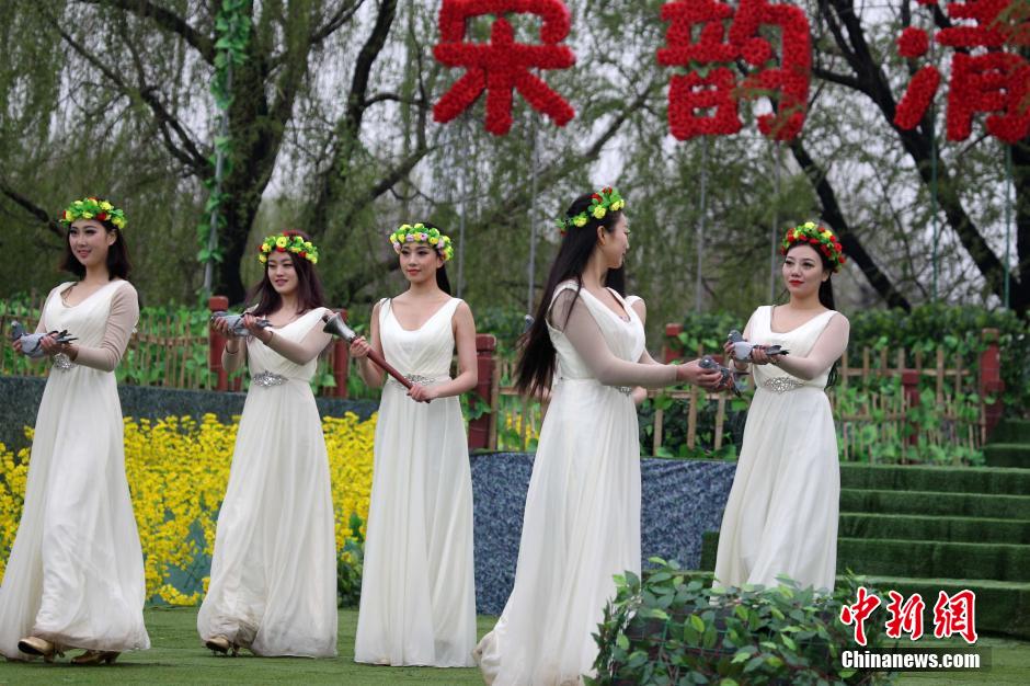 Girls in white dresses pass down the torch, a symbol of passing down the traditions of Qing Ming, at the Qing Ming cultural festival in Kaifeng, central China’s Henan, April 1, 2015. (Chinanews/Wang Zhongju)