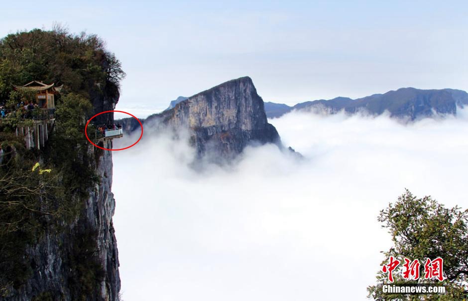 A sea of clouds appears at Tianmen mountain at Zhangjiajie, central China's Hunan province on March 30, 2015. Tourists can even see the light of Buddha under the glass plank road. (CNS/Ding Yunjuan)